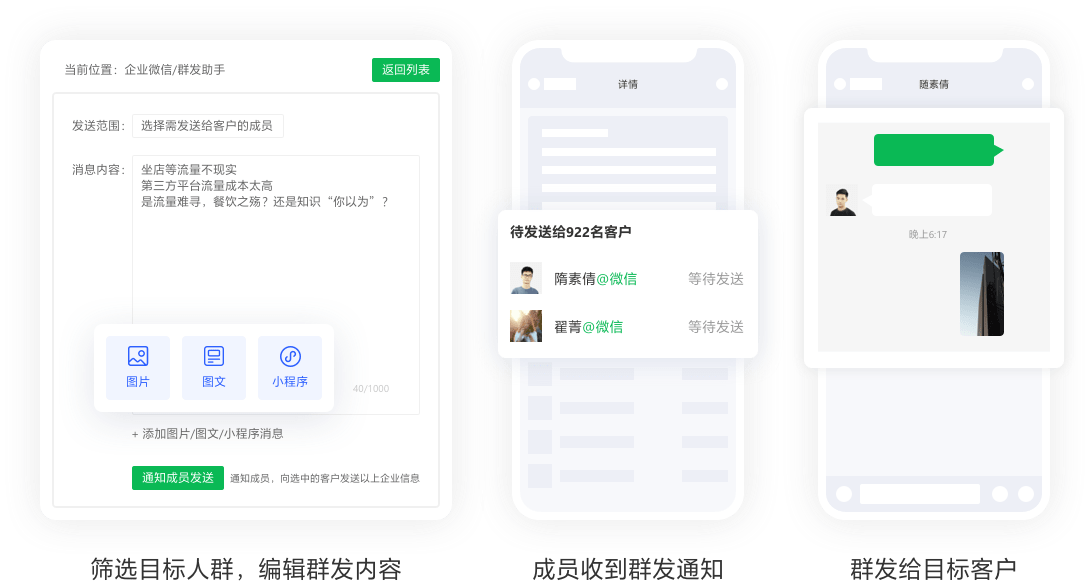 根据添加人或者标签筛选目标客户,可群发文字、图片、网页、小程序等内容,统一通知运功一键群发,实现1小时到1分钟员工确认群发;员工执行进度可实时查询